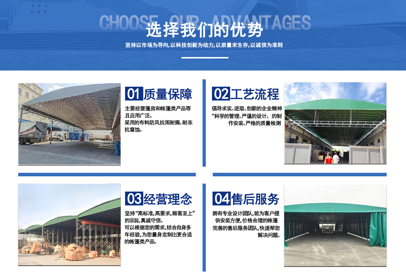 遼寧拓圖鋼結構工程有限公司是一家專業(yè)從事推拉篷設計、制作、安裝、使用、維修的綜合性公司。公司主營:電動雨棚、活動雨棚、倉庫雨棚、體育類雨棚、篷房、篷布、帳篷等系列產品的制作與安裝。 遼寧拓圖鋼結構工程有限公司堅持以市場為導向,以科技創(chuàng)新為動力,以質量求生存,以誠信為準則,倡導求實、進取、創(chuàng)新的企業(yè)精神。“科學的管理、嚴謹的設計、 的制作安裝、嚴格的質量檢測、良好的后期服務成就企業(yè)的信譽,為您提供優(yōu)質服務。 遼寧拓圖鋼結構工程有限公司傾力于開發(fā)應用三維空間結構與新材料的結合,將廣告藝術視覺表現(xiàn)形式與張力膜材科學的結合,推出多彩推拉蓬,依靠先進的科學技術,將推拉蓬建筑表現(xiàn)形式無限延伸,立志走在建筑科學的前沿,引導建筑時尚潮流,我們的目標是使推拉蓬建筑在中國發(fā)展壯大。 遼寧拓圖鋼結構工程有限公司憑著極強的事業(yè)熱情和豐富的專業(yè)經驗以“勤勉進取、銳意創(chuàng)新、至誠至信”的精神使公司得到迅速健康發(fā)展,業(yè)務范圍遍及全國。科學的管理、嚴謹的設計、高標準的制作安裝流程,嚴格把控產品質量,熱誠的售后服務是企業(yè)競爭力的源泉。 遼寧拓圖鋼結構工程有限公司人愿以最誠摯的態(tài)度,歡迎廣大客戶的蒞臨與溝通!愿為市場提供優(yōu)...